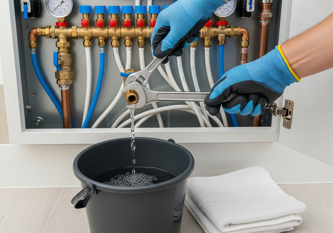 Najpierw znajdź skrzynkę z rozdzielaczem ogrzewania podłogowego – zwykle jest w centralnym punkcie domu. Wyłącz kocioł grzewczy i poczekaj, aż woda w instalacji całkowicie wystygnie. To bardzo ważne dla Twojego bezpieczeństwa. W międzyczasie przygotuj narzędzia i zabezpiecz podłogę ręcznikami.
